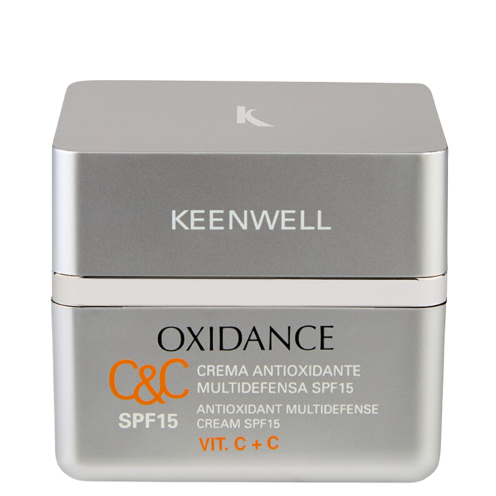 Produsele liniei OXIDANCE, create in laboratorul KEENWELL, contin antioxidanti care neutralizeaza radicalii liberi, protejeaza impotriva leziunilor oxidative si stimuleaza regenerarea si refacerea celulelor. Datorita acestor produse, pielea este hidratata eficient, se reduce descuamarea si alte semne ale stresului oxidativ. Dupa prima utilizare, pielea devine mai elastica, mai neteda si mai luminoasa. Ridurile si celelalte semne ale imbatranirii pielii sunt diminuate. Crema usoara, proaspata, cu absorbtie rapida. Contine vitamina C stabilizata natural in molecula de glucoza. Dupa aplicare, enzima alfa-glucozidaza prezenta in celulele pielii elibereaza treptat moleculele de vitamina C. Vitamina C, cu excelente proprietati antioxidante si de refacere a pielii. Protejeaza impotriva radicalilor liberi, stimuleaza sinteza de colagen si netezeste ridurile de expresie si alte tipuri de riduri. Aquafill sistem de incapsulare in vezicule de glicosfingolipide. Aceste vezicule formeaza pe piele o nanopelicula care amplifica eficienta ingredientelor active acid hialuronic si beta-glucani extrasi din orz. Aquafill asigura o hidratare de lunga durata si intareste bariera lipidica a pielii. Are efect de umplere a ridurilor si porilor, oferind rezultate excelente pe termen lung. Nanoparticule cu polifenoli din struguri si tocoferol, care actioneaza sinergic, neutralizand radicalii liberi si crescand rezistenta pielii la efectele nocive ale razelor UV. Polifenolii din masline protejeaza pielea impotriva poluarii si neutralizeaza radicalii liberi. Ingrediente active: vitamina C, polifenoli din struguri, polifenoli din masline, Aquafill sistem de incapsulare in vezicule de glicosfingolipide. Mod de utilizare: dimineata, aplicati pe pielea curata si tonifiata a fetei, gatului si decolteului. Ingrediente: AQUA (WATER), Di-PPG-3 MYRISTYL ETHER ADIPATE, ETHYLHEXYL METHOXYCINNAMATE, PROPANEDIOL, ORYZA SATIVA (RICE) BRAN OIL, OCTOCRYLENE, BUTYL METHOXYDIBENZOYLMETHANE, HYDROXYETHYL ACRYLATE/SODIUM ACRYLOYLDIMETHYL TAURATE COPOLYMER, CI 77891 (TITANIUM DIOXIDE), SQUALANE, ASCORBYL GLUCOSIDE, PHENOXYETHANOL, MICA, ALCOHOL DENAT. (ETHANOL), TROMETHAMINE (TRIS(HIDROXYMETHYL)AMINOMETHANE), POLYSORBATE 60, DISODIUM EDTA, PARFUM (FRAGRANCE), ETHYLHEXYLGLYCERIN, TIN OXIDE, SORBITAN ISOSTEARATE, GLYCOSPHINGOLIPIDS, HORDEUM VULGARE EXTRACT, SODIUM HYALURONATE.